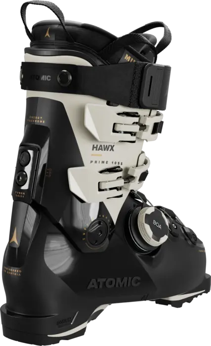 The Atomic Hawx Prime 105 S BOA W GW is a versatile women’s alpine boot for all-mountain skiers that can handle all-day charging on a range of inbounds terrain. It has a mid-volume 100mm last and medium 105 flex. BOA® Fit System on the lower shell wraps the foot for a precise fit that can be micro-adjusted in both directions. Advanced Prolite construction starts with a slim profile and adds reinforcements in key areas for strong downhill performance. A Mimic Gold liner is pre-shaped around the ankle and heel and can be customized for the optimal fit with heat-moldable Mimic technology. With Memory Fit, the shell and cuff can be easily shaped to the foot through in-store heat fitting. The boot has a lower cuff and more volume in the leg to fit the unique shapes of women’s calves. Remove the Adaptive Fit System (AFS) Cuff spoiler to make even more room in the lower leg. Power Shift 2.0 helps you adjust forward lean and flex independently. Cantable GripWalk pads combine added traction and grip with the power transfer of a standard alpine sole..