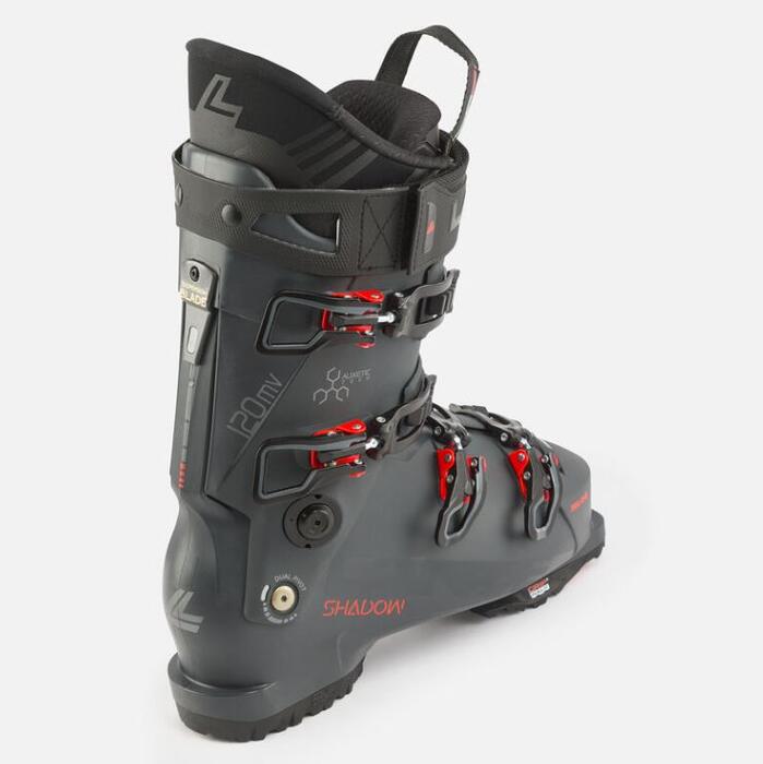 More power and more control with less energy. The Lange Shadow 120 MV ski boots bring a new level of power transfer, vibration absorption and comfort to all-mountain skiing. Our Assisted Performance System amplifies your input to the boot through the mechanical advantage of our Dual Pivot and Suspension Blade technology. The design boosts input by up to 26%, giving you more power and control with less energy. The boot's clean, consistent flex is combined with increased shock absorption through the shell for enhanced snow feel and contact. Like a full suspension bike, the combination lets you ski longer and more efficiently. Together with a 120-rated flex, this boot gives advanced and expert skiers a strong platform for ripping across the whole mountain. At 100mm wide, our medium-volume last complements the thermoformable liner to offer all-day comfort.