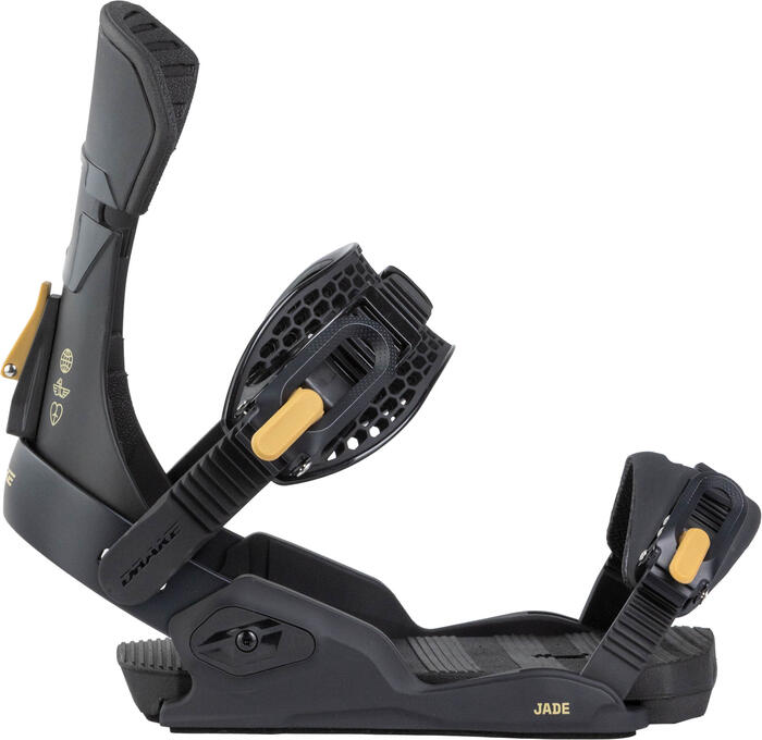 Elevate your ride with the Drake Jade Snowboard Bindings, lightweight and versatile women-specific bindings designed for all-mountain performance and comfort. Built around the Delta Evo baseplate with reinforced nylon and aluminum, they deliver responsive power transfer and durability without extra weight — perfect for riders who want performance and playfulness in one package. The Spade light frame highback offers a smooth mix of flex and control, while the Honey ankle straps mould comfortably to your boots for a secure fit without pressure points.