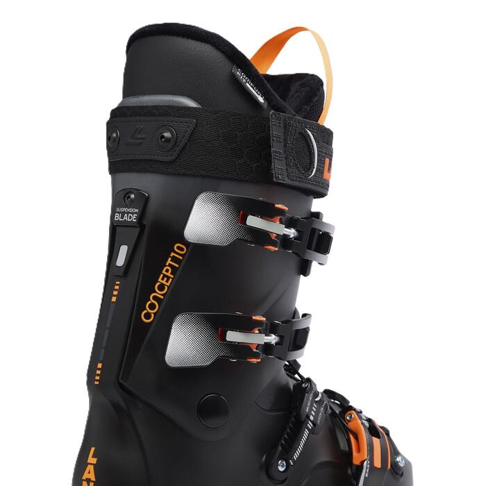 Put comfort first with boots that fit and feel as great as they ski. The Lange Concept 10 ski boots set a new standard for comfort and ease of use in an all-mountain ski boot. They combine a roomy Comfort Last and Lange's Easy Entry and Exit design with Comfort Tongue to make a boot that's easy to get into, fits great and performs great. Our Suspension Blade system connects the upper and lower boot for smooth power transfer and confidence through every turn. Combined with a EASY Closure buckle system and a custom thermoformable liner, the Concept 10 boots balance fit and performance to keep you focused on the fun. Their 100-rated flex is designed for intermediate skiers who prioritise all-day comfort. A simple adjustable insert on the cuff lets you soften the flex by 8%.