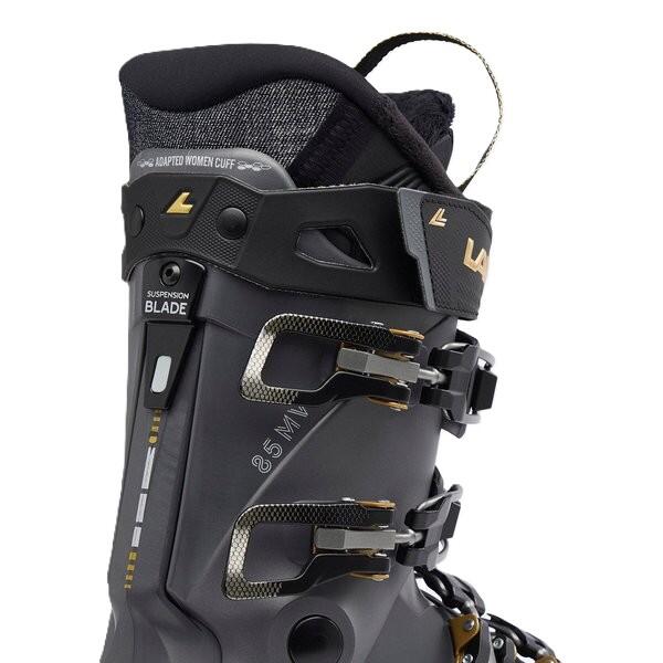 More power and more control with less energy. The women's Lange Shadow 85 MV ski boots bring a new level of power transfer, vibration absorption and comfort to all-mountain skiing. Assisted Performance System amplifies your input to the boot through the mechanical advantage of our Dual Pivot and Suspension Blade technology. The design boosts input by up to 26%, giving you more power and control with less energy. The boot's clean, consistent flex is combined with increased shock absorption through the shell for enhanced snow feel and contact. Like a full suspension bike, the combination lets you ski longer and more efficiently. Together with a moderate 85-rated flex, this boot gives beginner and intermediate skiers a strong platform to keep their ski progression moving forward. The women's-specific shell and 100mm-wide, medium-volume last complement the thermoformable liner to offer all-day comfort.