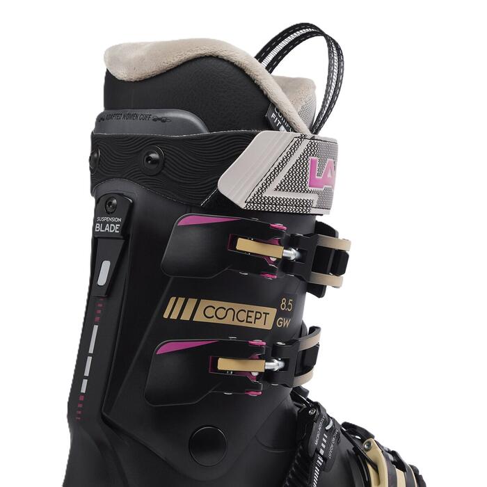 Put comfort first with boots that fit and feel as great as they ski. The women's Lange Concept 8.5 ski boots set a new standard for comfort and ease of use in an all-mountain ski boot. They combine a roomy Comfort Last with Easy Entry and Exit design with Comfort Tongue to make a boot that's easy to get into, fits great and performs great. Lange's Suspension Blade system connects the upper and lower boot for smooth power transfer and confidence through every turn. With a women's-specific cuff and thermoformable line plus a EASY Closure buckle system, the Concept 8.5 boots balance fit and performance to keep you focused on the fun. Their 85-rated flex is designed for intermediate skiers who prioritise all-day comfort. A simple adjustable insert on the cuff lets you soften the flex by 8%.